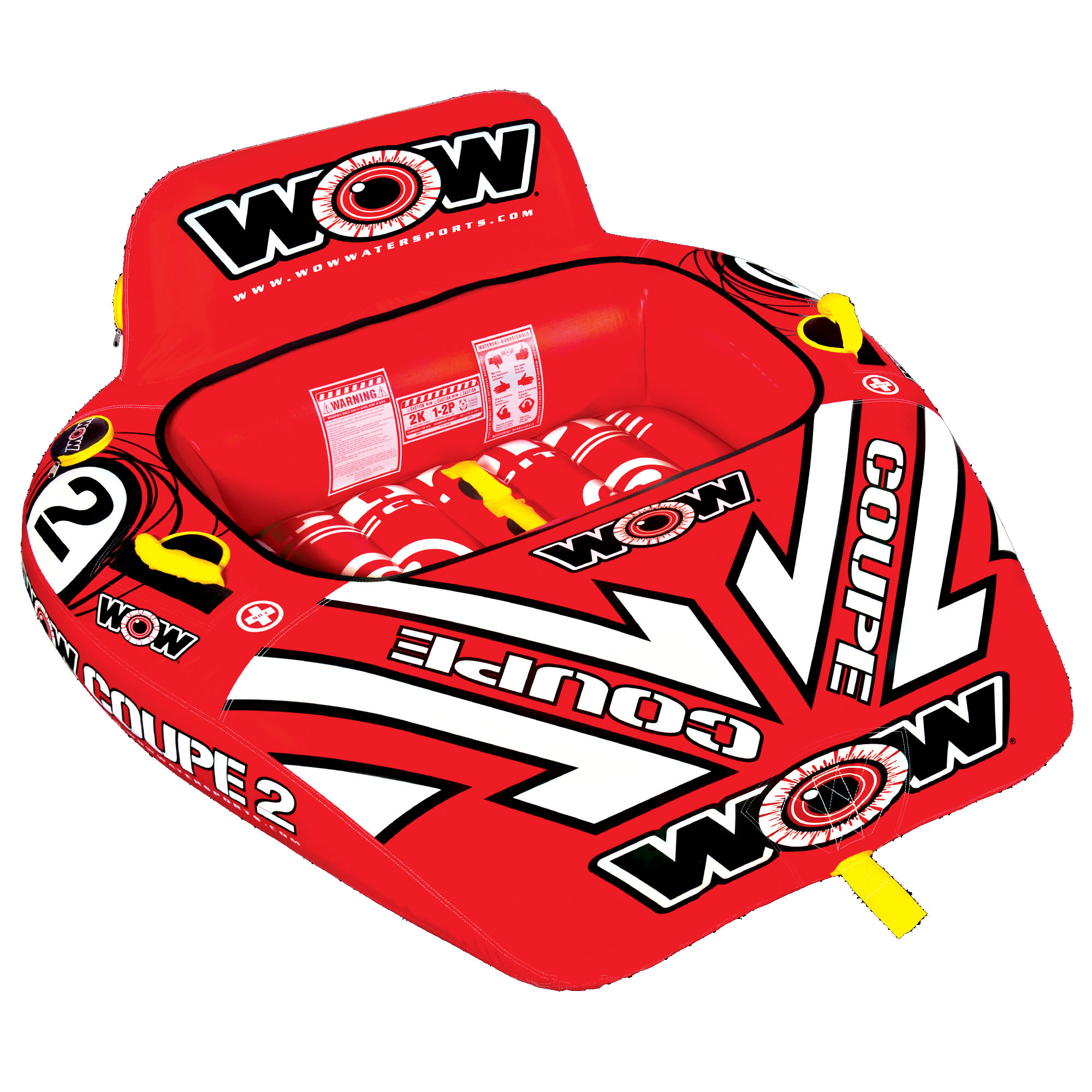 The Coupe Series is another WOW take on an old design. We took out the seat dividers on the basic cockpit tube so that we could add our drop bottom design. This turns your basic cockpit tube into not only a towable that is fast and balanced over the wake and in the whips, but also a comfortable and relaxing floating lounge that will be just what you need after your exciting ride. The Coupes look great on the water in their hot rod red design. Try the Coupe 1, 2, or 3 rider towable/lounge and save on space in your boat by taking just one item with you instead of two. EZ 2 Ride.