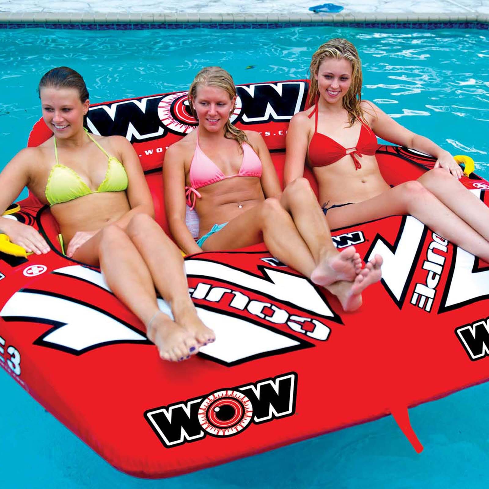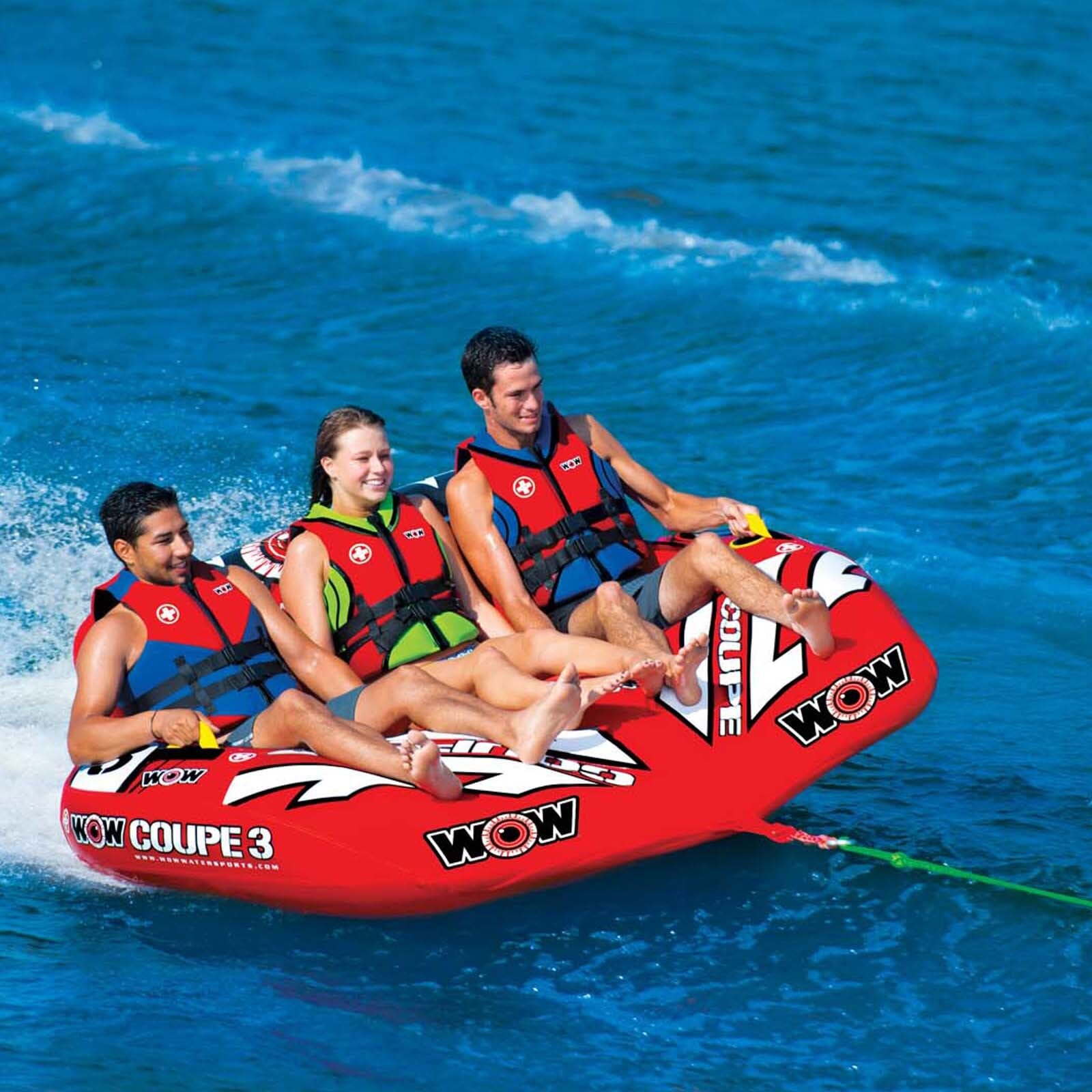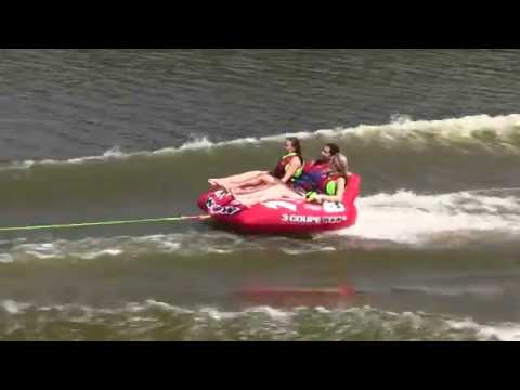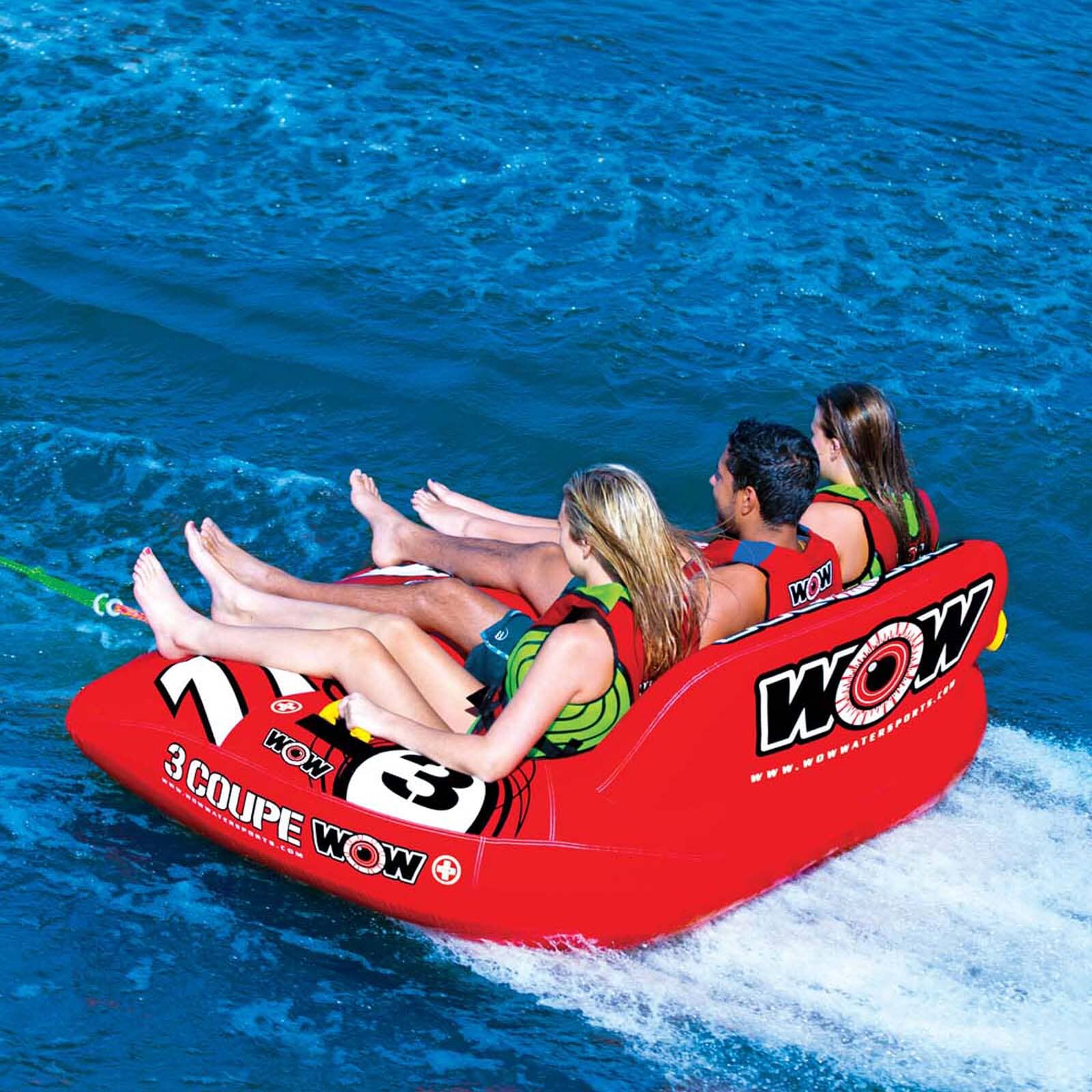 The Roadster Towable from WOW, with seat dividers out of the way, this cockpit tube has a drop bottom design. This turns your basic cockpit tube into not only a towable that is fast and balanced over the wake and in the whips, but also a comfortable and relaxing floating lounge that will be just what you need after your exciting ride. The Roasdter looks great on the water in their hot rod slick blue design.