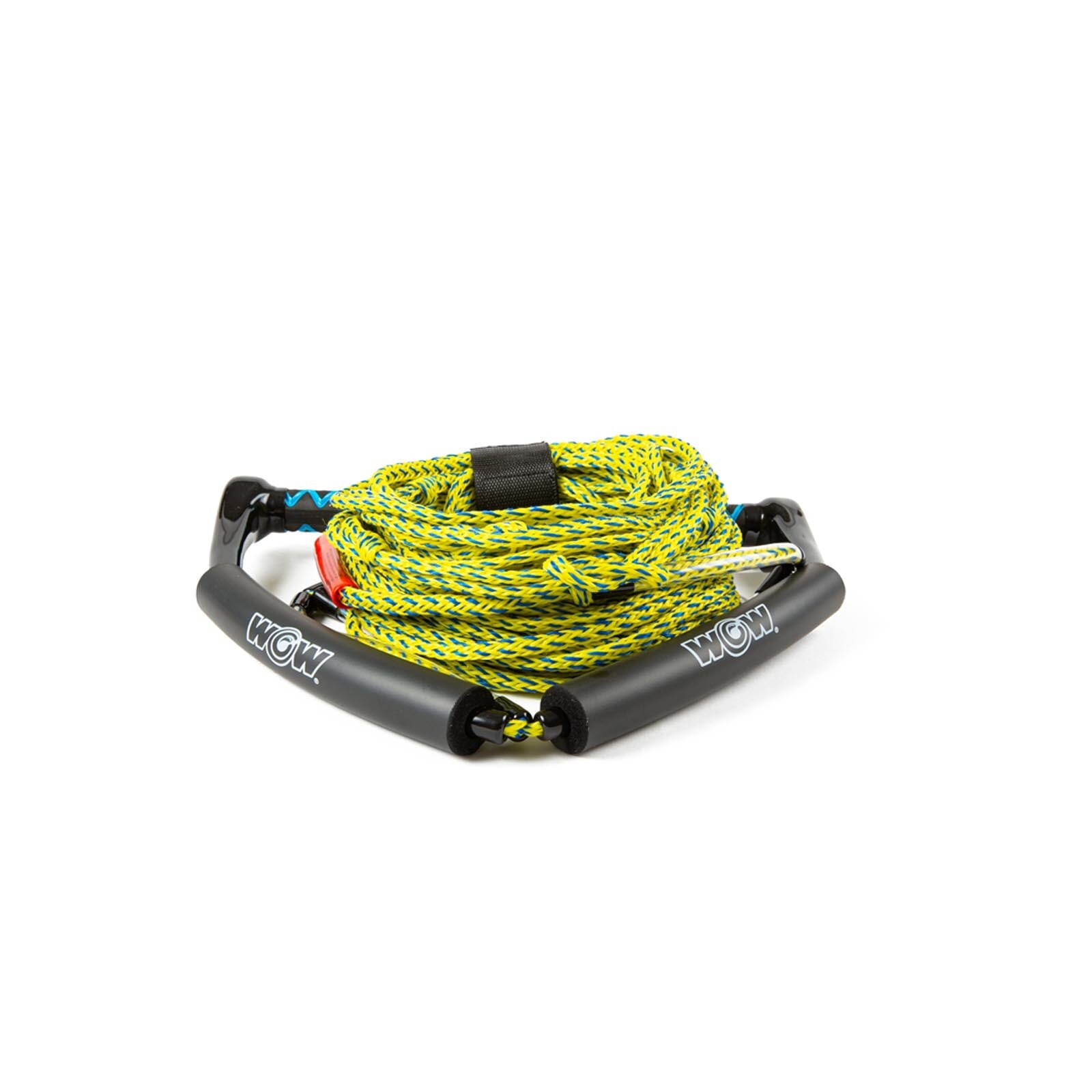 A solid 70 ft 50-section wakeboard rope with, made with a TPR covered aluminum 6 inch handle, combined with 15 inches of double-density EVA grip for cushion and support. A 16 strand-low stretch wake board rope, rated at a 1,200 lbs tensile strength.