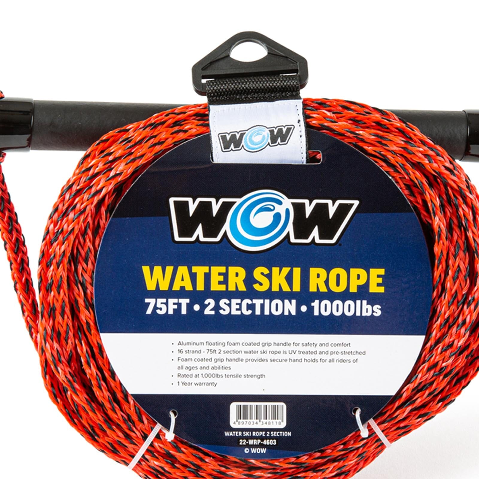 This water ski rope is rated up to 1000 lbs tensile strength and made for towing behind a boat. Made with an aluminum floating foam coated grip handle for safety and comfort. It also provides secure hand holds for different aged riders and abilities. The 75' 2-section water ski rope is UV treated and pre-stretched.