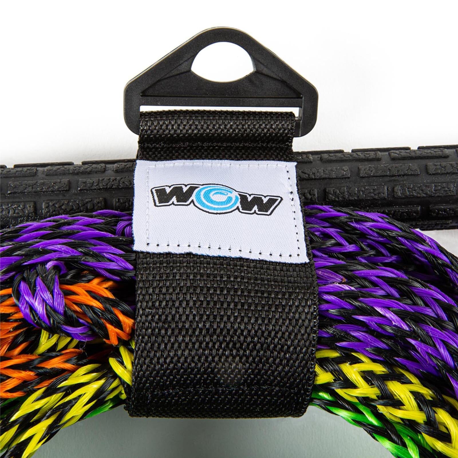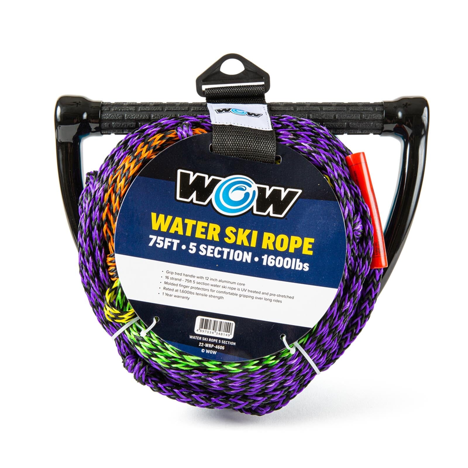 This water ski rope is rated up to 1600 lbs tensile strength and made for towing behind a boat. Made with a floating grip tread handle with a 12 inch aluminum core. It also has molded finger protectors with end caps for comfortable gripping over long rides. The 16 strand, 5-section water ski rope is UV treated and pre-stretched.