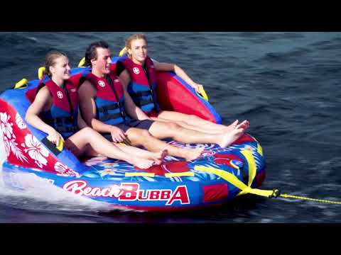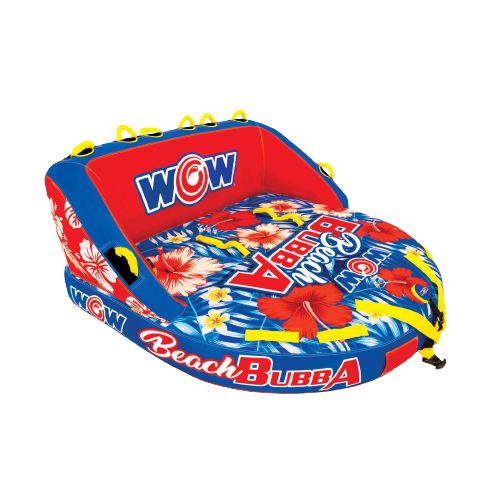 Lean on back and enjoy the ride with the three-person Beach Bubba. The extra high backrest and sidewalls make everyone feel secure and comfy on the water during extra fast, bouncy rides. Ride your way: standing chariot style, kneeling chariot, or even laying down! The double webbing foam handles will help you hold on tight no matter what you choose. The Beach Bubba has a smooth, comfortable surface all over, for a comfortable ride. We also enhanced it with some HI-VIS graphics that won't rub or chip off, so it stays looking stellar summer after summer. Includes a one-year warranty.