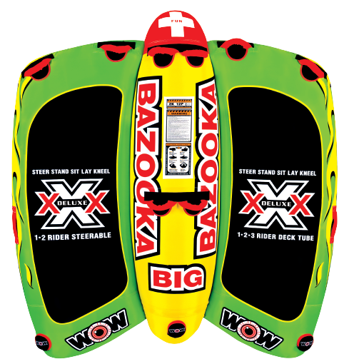 Deck Tubes have been the bestselling style of tubes for years, but they havent changed much since they first hit the market 20 years ago. WOW wanted to develop a more exciting, multi-functional deck tube with options. What we came up with is the Big Bazooka. It is a completely new style deck tube that allows you to do much more than the traditional deck tube. The Big Bazooka holds up to 4 riders and can be used in 1, 2, 3 and 4 person configurations. You can kneel, sit, stand or lay on this deck tube. You can still hold on for dear life as the boat driver does twists and turns, but the best part of the Big Bazooka is that you can also take control of your ride. Our patent pending Flex Wing system allows the riders to be in control. Steer by yourself or as a team and fly back and forth over the boat wake while the boat driver goes straight. The testing team at WOW thinks this is the most exciting deck tube to hit the market