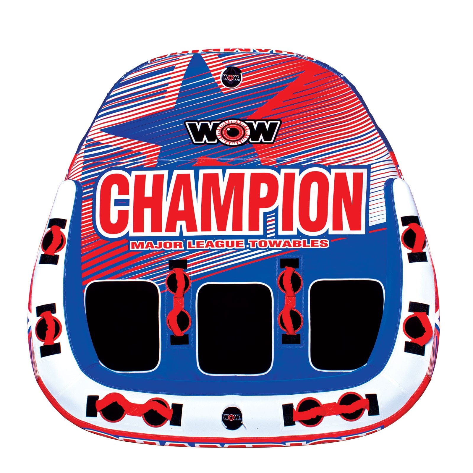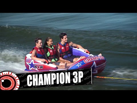 Be a Winner on the Water this Summer. The Champion 3 is a towable that has been designed and worked in over time -- to fit like a glove. The EZ-Up Nose on the Champion allows for minimal drag, making takeoffs a breeze, a footrest for lounging or a spray blocker for the riders while in action. The side rests are EXTRA long to protect the riders. Padded protection means- NO shoulder pads needed! Load your bases onto the SECURE DECK SEATING; get thrown into the outfield anyways? The Champion is made with great boarding leverage points to get right back to the game! This is the winning series when it comes to family towables. WOW, blowing the competition out of the water, again and again.