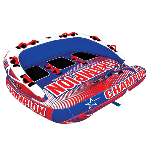 Be a Winner on the Water this Summer. The Champion 3 is a towable that has been designed and worked in over time -- to fit like a glove. The EZ-Up Nose on the Champion allows for minimal drag, making takeoffs a breeze, a footrest for lounging or a spray blocker for the riders while in action. The side rests are EXTRA long to protect the riders. Padded protection means- NO shoulder pads needed! Load your bases onto the SECURE DECK SEATING; get thrown into the outfield anyways? The Champion is made with great boarding leverage points to get right back to the game! This is the winning series when it comes to family towables. WOW, blowing the competition out of the water, again and again.