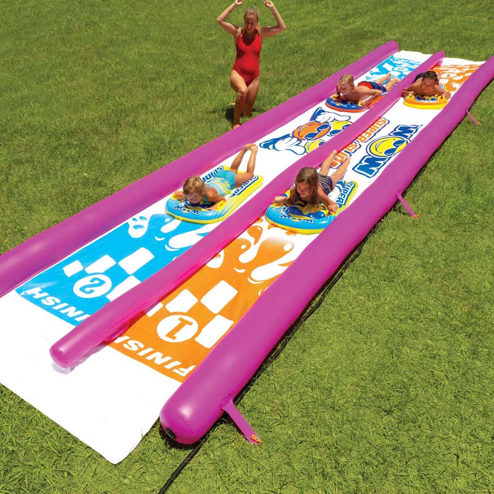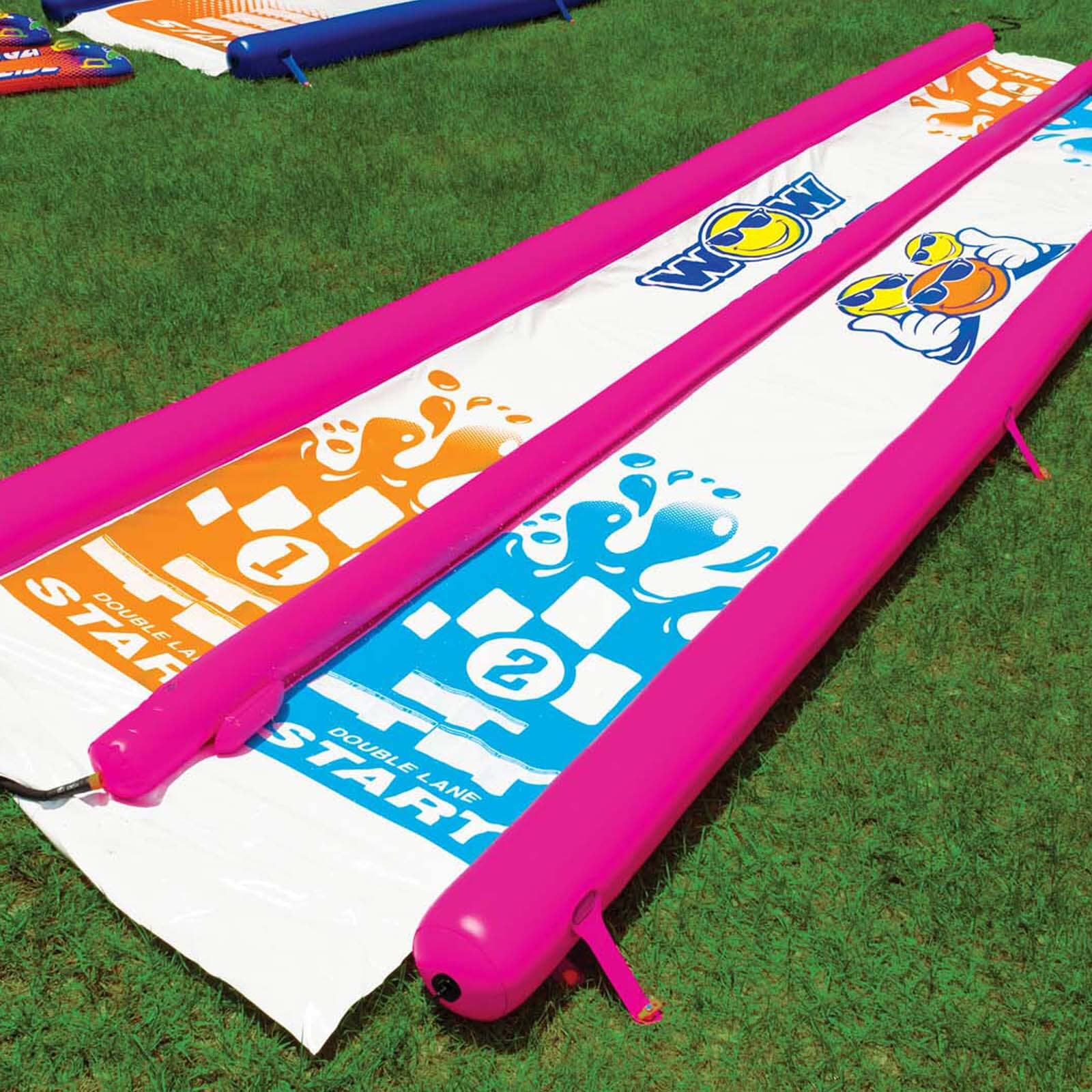 Double the fun: This DOUBLE-Lane WOW Water Slide for the lawn that will keep the kids entertained all day long. The slide is made from extra thick, heavy-duty, super-slick embossed PVC. In fact, it is more than twice as thick as most of the slides you will find in the market AND its backed by WOW’s 1-year warranty. Our zig-zag patterned, 25′ embedded sprinkler system, connects to the standard backyard hose, runs the length of the slide and has 100% water coverage so no dry spots. That’s not even the best part – this slide can attach to an optional attached pool at the end for more SPLASH action. Each slide comes with 2 inflatable sleds to cushion the fall and make the slide even more slippery. Connect to a garden hose and GO! Expect a long, wet, and fast ride!