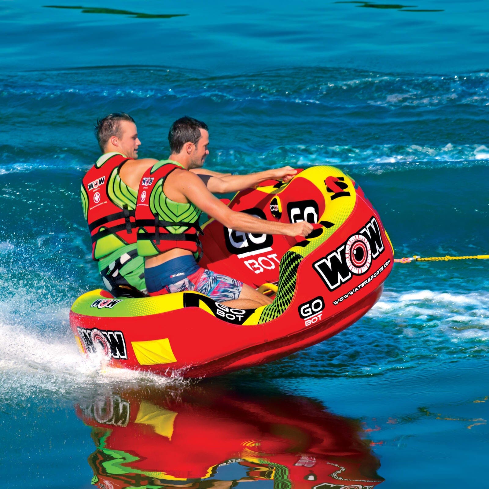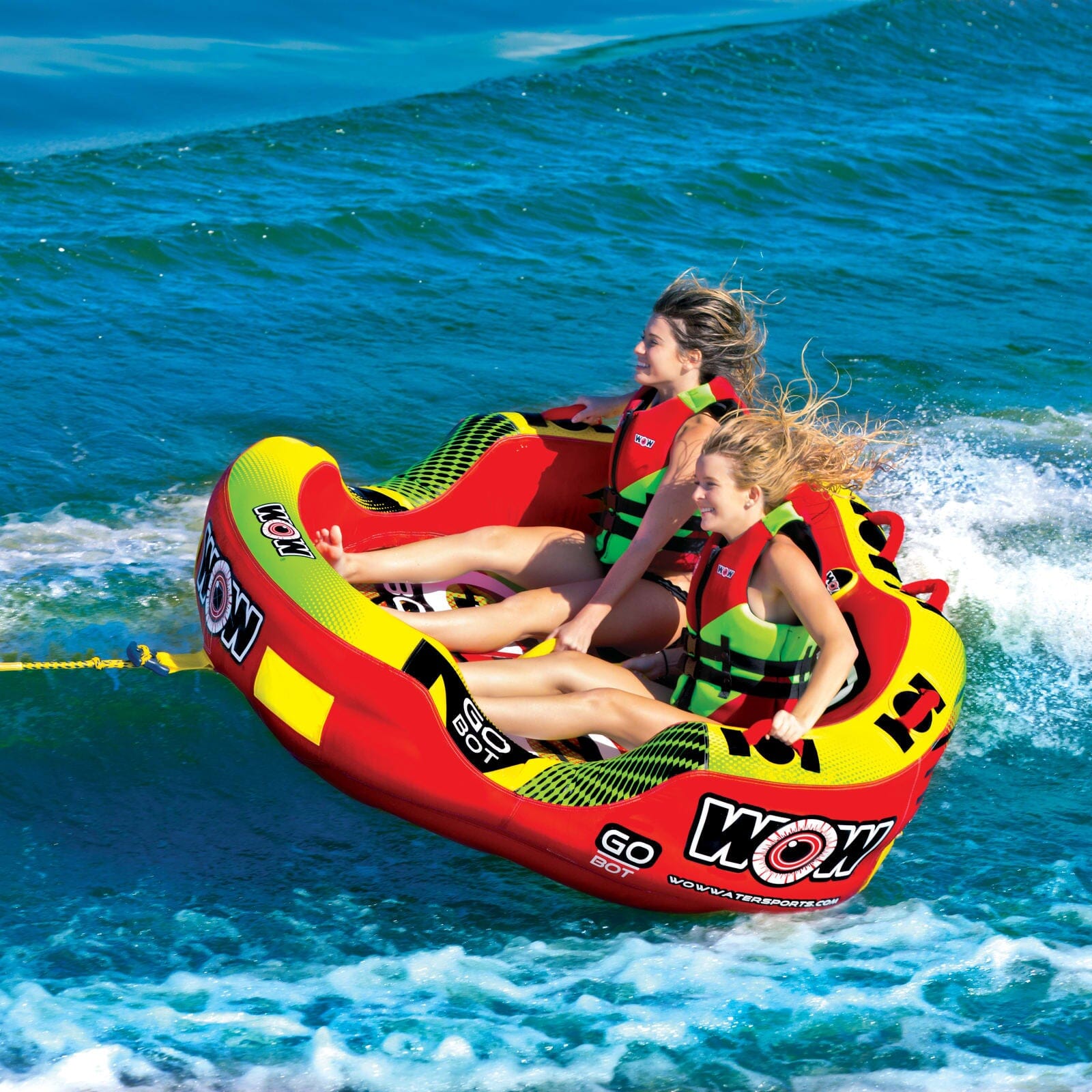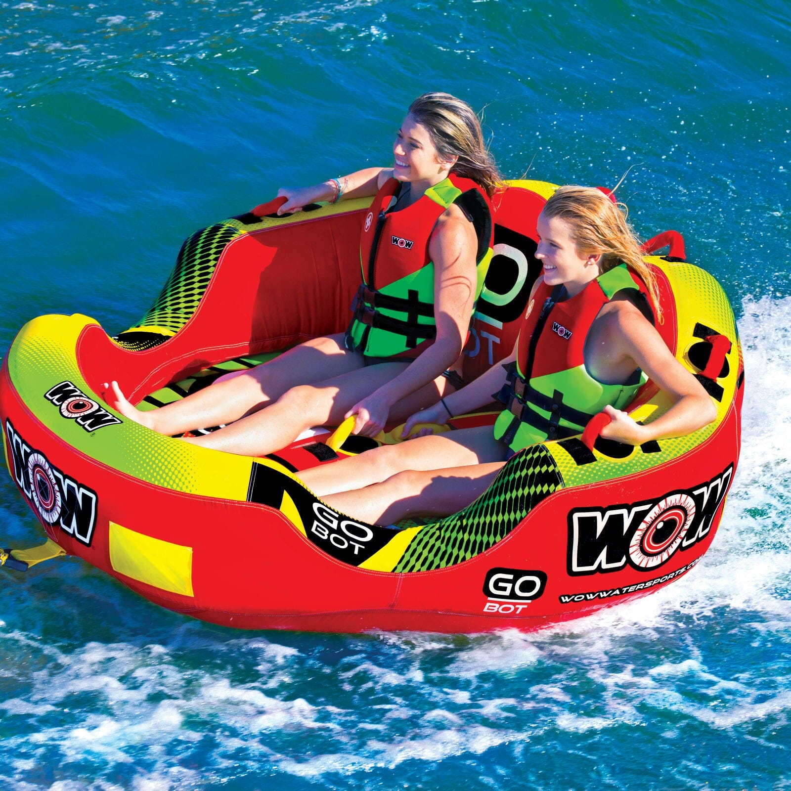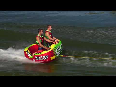 Get going on the water with the Go Bot Towable from WOW.  Designed with family fun in mind, the Go Bot makes a great towable for the youngest to the oldest in the family.  Ride in the seated position from the front tow point or connect the rope to the back tow point and ride chariot style.  The deep cockpit seating with high backrest makes the riders feel more secure while the drop speed bottom glides smoothly over the water creating less drag on the boat and therefore better gas mileage.  Our new slotted EZ entry system makes it easier than ever to get back on the towable if you do happen to get thrown out of it.  The Go Bot will be loved by everyone in the family; from those that like a nice and easy ride to those that want something more extreme.