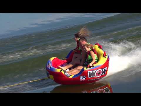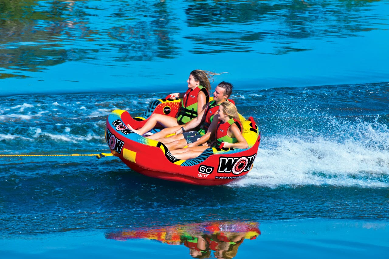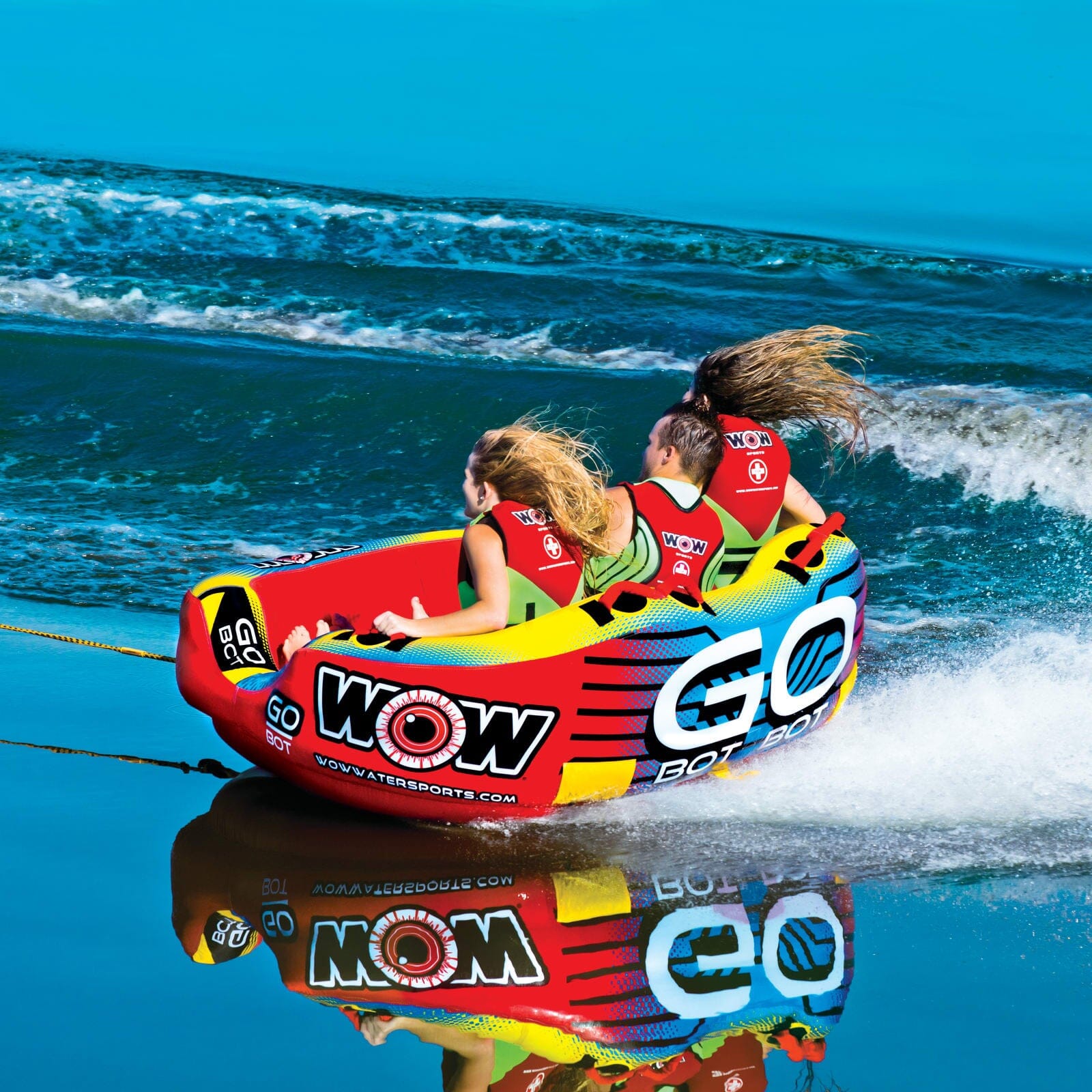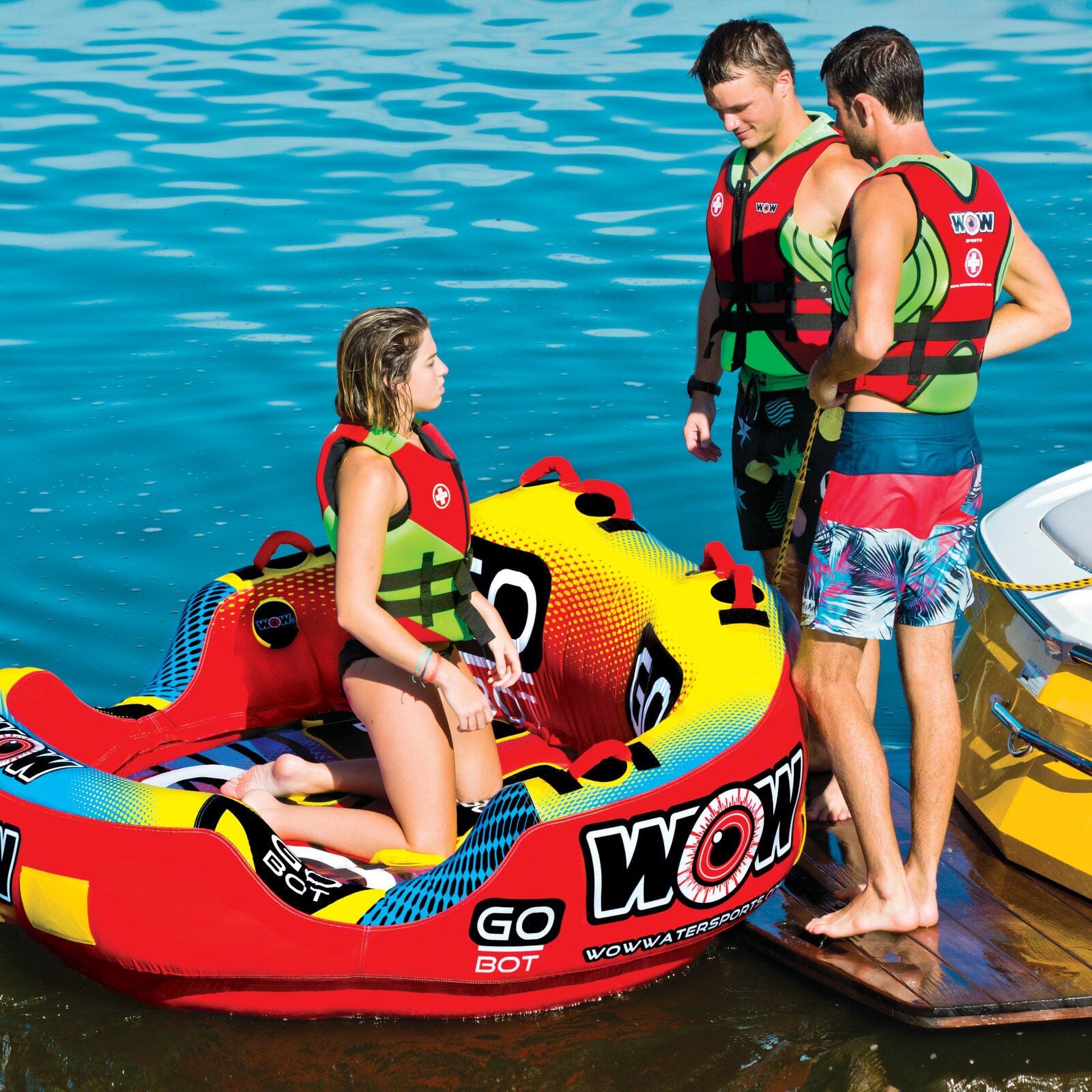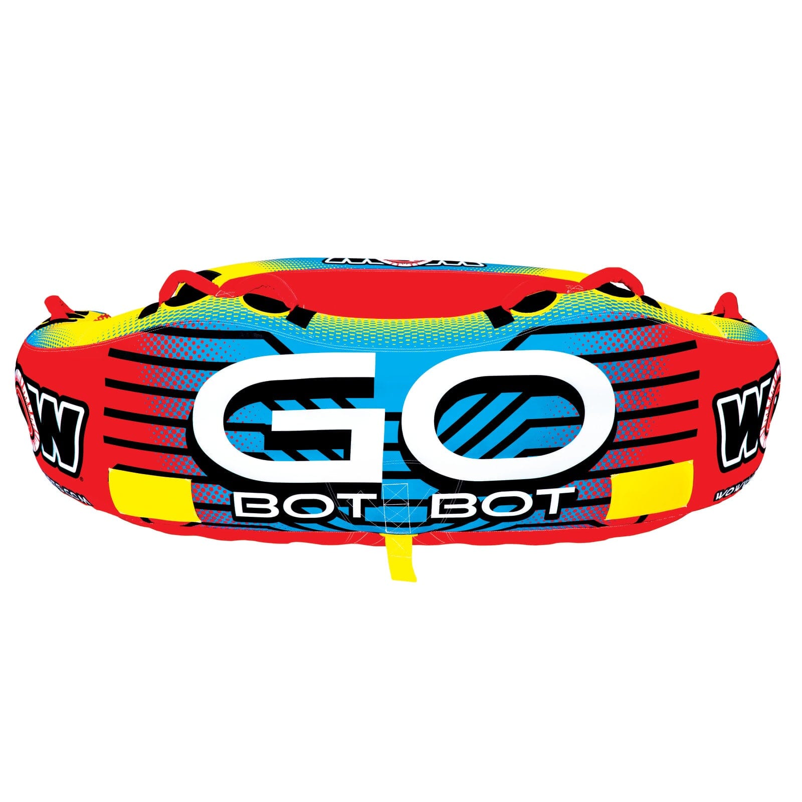 Get going on the water with the Go Bot Towable from WOW. Designed with family fun in mind the Go Bot makes a great towable for the youngest to the oldest in the family. Ride in the seated position from the front tow point or connect the rope to the back tow point and ride chariot style. The deep cockpit seating with high backrest makes the riders feel more secure while the drop speed bottom glides smoothly over the water creating less drag on the boat and therefore better gas mileage. Our new slotted EZ entry system makes it easier than ever to get back on the towable if you do happen to get thrown out of it. The Go Bot will be loved by everyone in the family; from those that like a nice and easy ride to those that want something more extreme.
