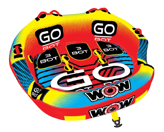 Get going on the water with the Go Bot Towable from WOW. Designed with family fun in mind the Go Bot makes a great towable for the youngest to the oldest in the family. Ride in the seated position from the front tow point or connect the rope to the back tow point and ride chariot style. The deep cockpit seating with high backrest makes the riders feel more secure while the drop speed bottom glides smoothly over the water creating less drag on the boat and therefore better gas mileage. Our new slotted EZ entry system makes it easier than ever to get back on the towable if you do happen to get thrown out of it. The Go Bot will be loved by everyone in the family; from those that like a nice and easy ride to those that want something more extreme.