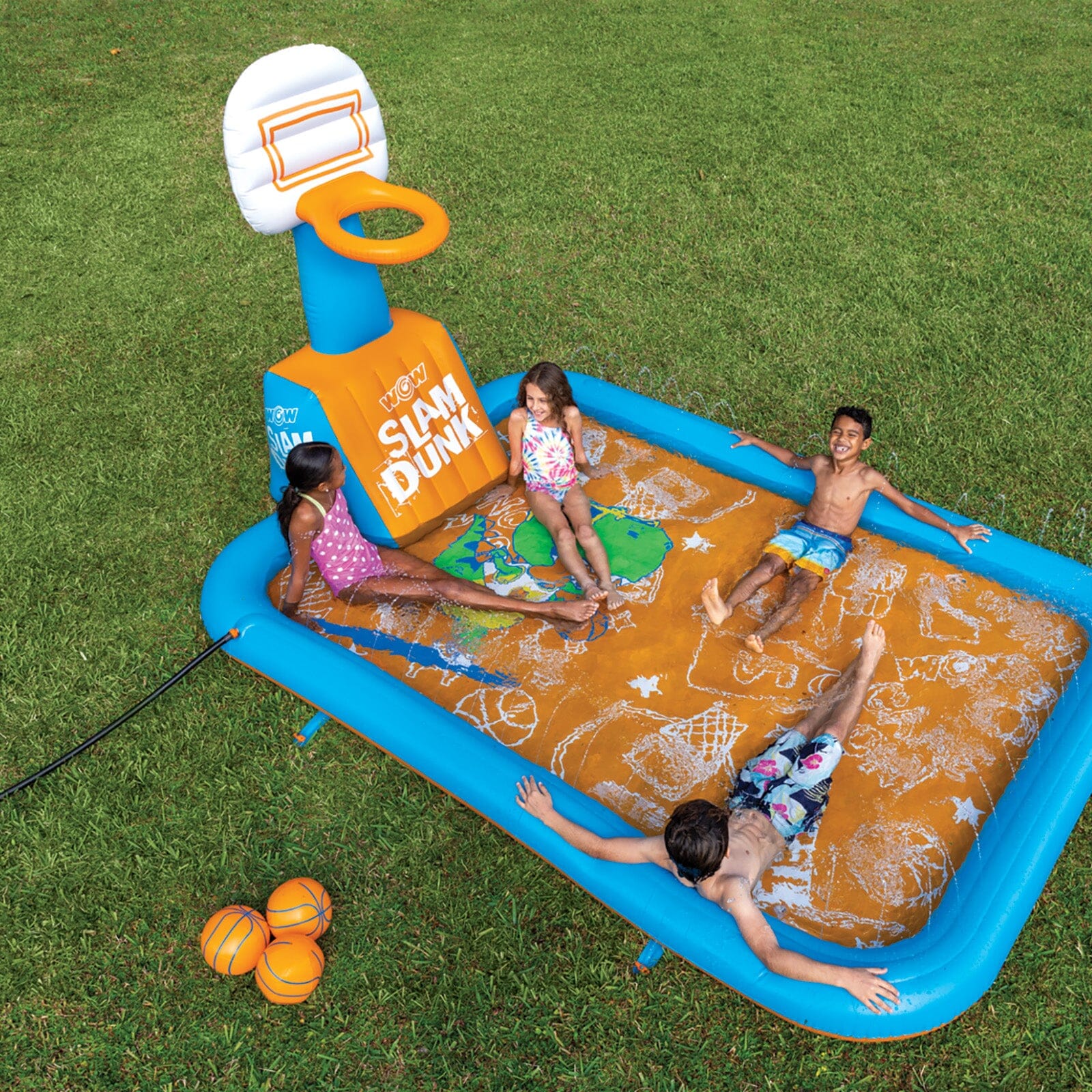 Hoop, there it is! This slam-dunk of a splash pad isn't your average backyard sprinkler. It doubles as a basketball court (if the court was flooded). Imagine playin' H-O-R-S-E on this thing!