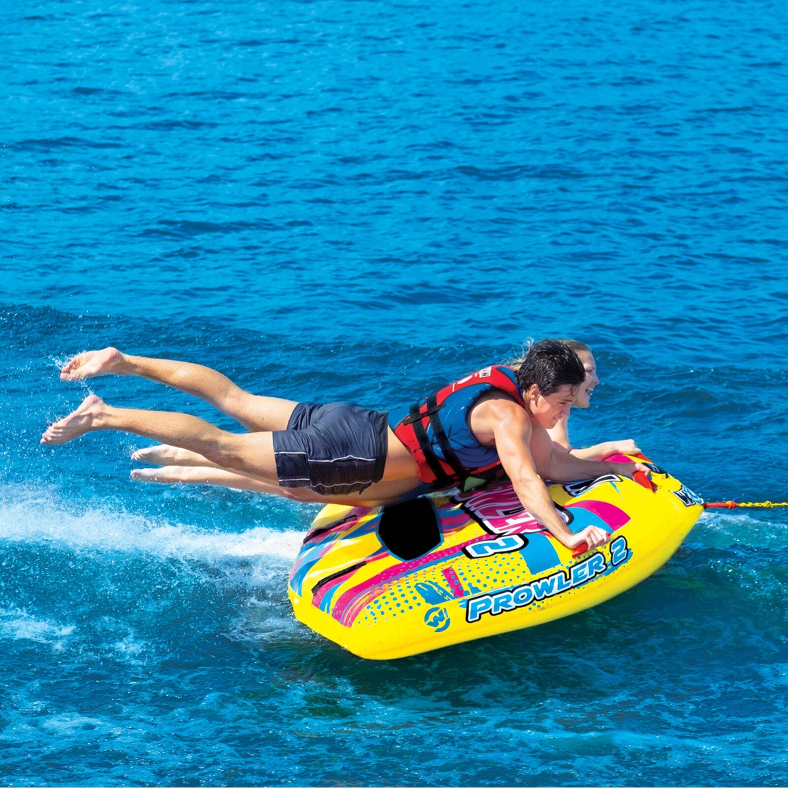 Not even the coolest cats and kittens will land on their feet when thrown from the Prowler 2. Hitch it up for a wild ride, take a waterside cat-nap or bring it on your next floating excursion. This kitty has everything you need for the prowl: the D-shaped towable, 12v pump for inflation, and 1 rope. The Prowler also inflates in no time, so you can get on the water sooner. It also deflates fast when you're ready to call it a day and head home.