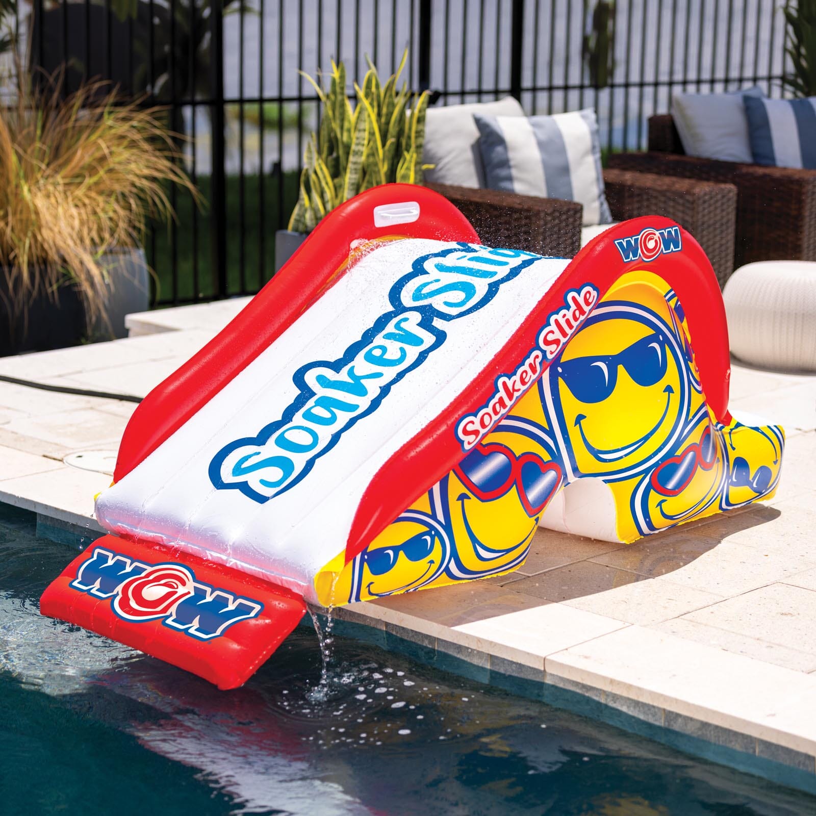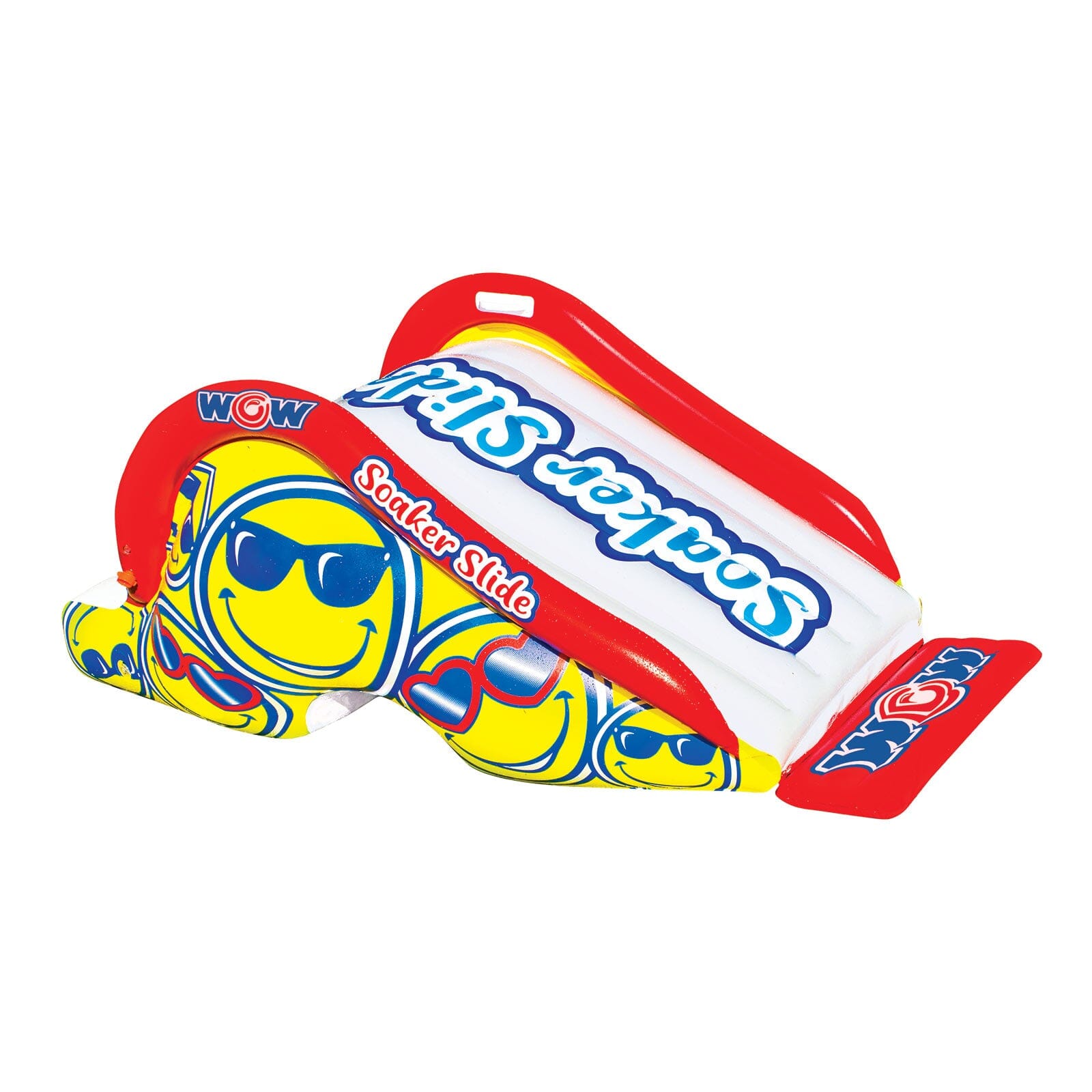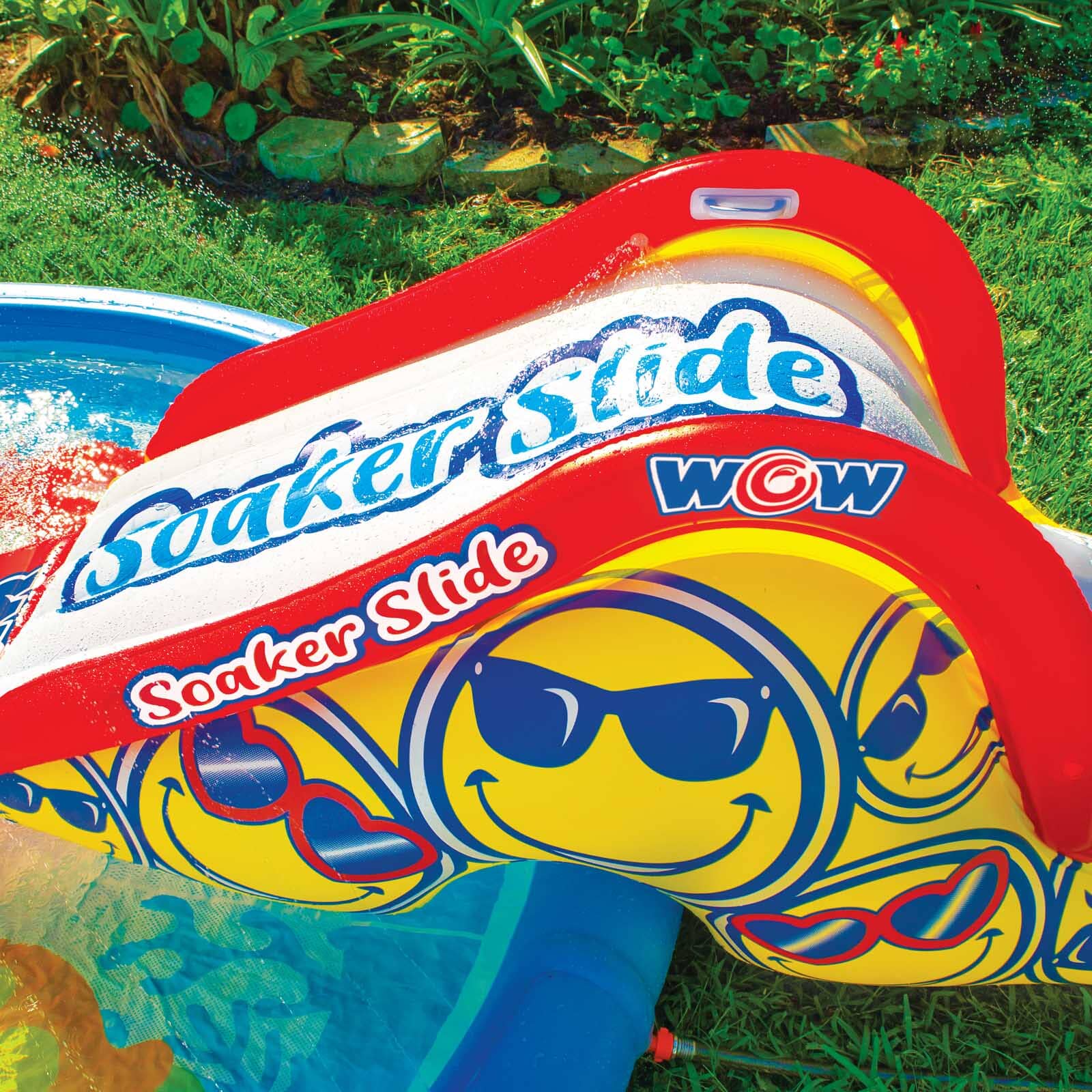 ADD to your PAD with WOW's Soaker Splash Pad Slide. This easy to set-up inflatable has a tunnel that fits over the pontoons of our WOW Splash Pads for secure stable sliding. Built in soaker sprinkler creates a wet fast sliding surface that connects easily to any standard garden hose. EZ boarding step design with moulded handles. At the bottom of the slide, there is a WOW slide bumper for easy entry into the water.
