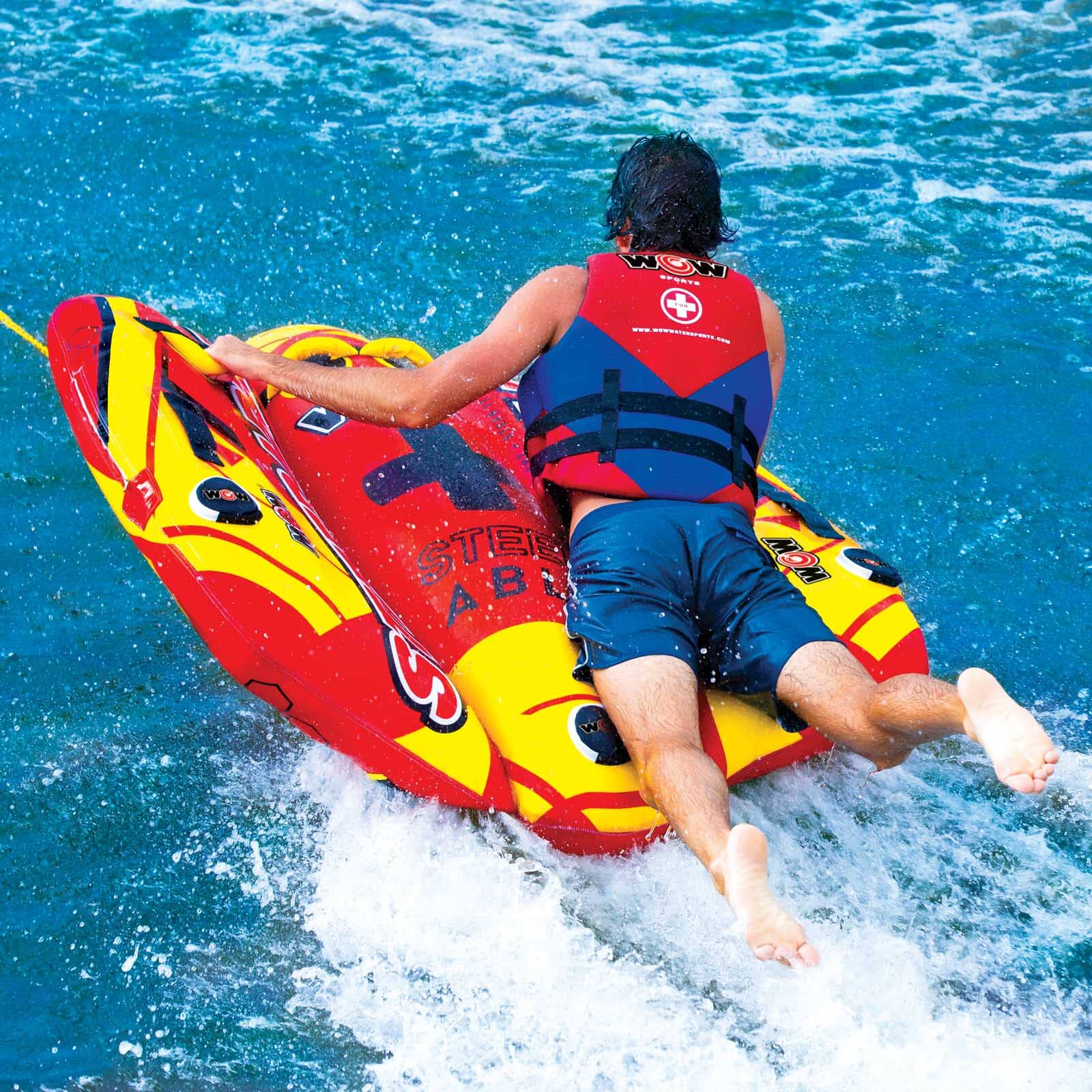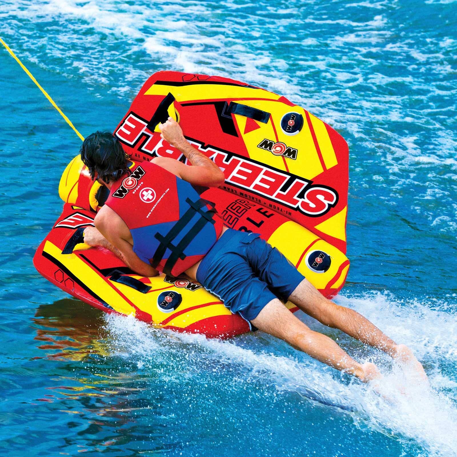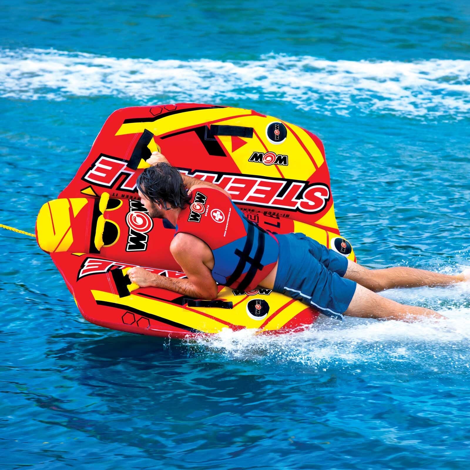 This totally STEERABLE towable is the ideal ride for those with a sense of adventure! This flexing twist on the traditional deck tube makes it go from following the boat to chasing the boat. This exciting, multi-functional tube allows you to do much more than the traditional deck tube. You can kneel, sit, stand or lay on this tube. You can still hold on and use it as a deck tube and let the boat driver do the twists and turns OR you can take control of your ride and weave the wake. Our patented Flex Wing system allows the riders to be in control. The Steerable – its all in the name!