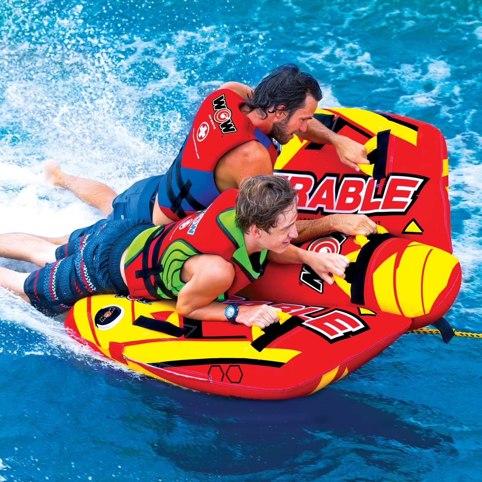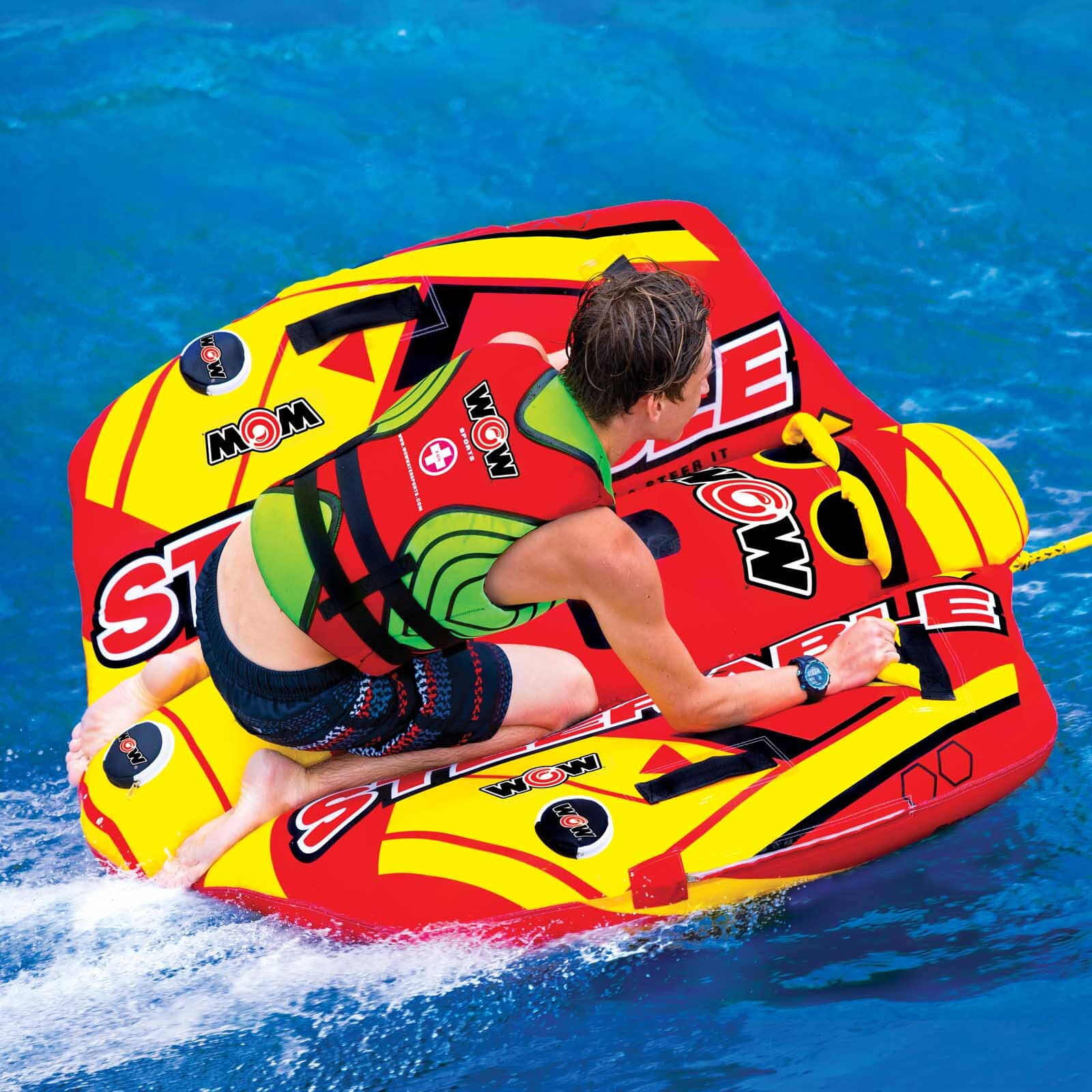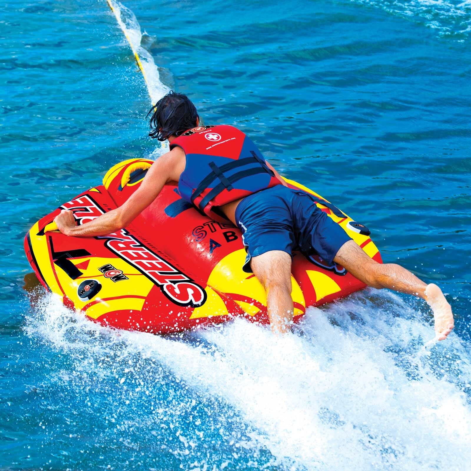 This totally STEERABLE towable is the ideal ride for those with a sense of adventure! This flexing twist on the traditional deck tube makes it go from following the boat to chasing the boat. This exciting, multi-functional tube allows you to do much more than the traditional deck tube. You can kneel, sit, stand or lay on this tube. You can still hold on and use it as a deck tube and let the boat driver do the twists and turns OR you can take control of your ride and weave the wake. Our patented Flex Wing system allows the riders to be in control. The Steerable – its all in the name!