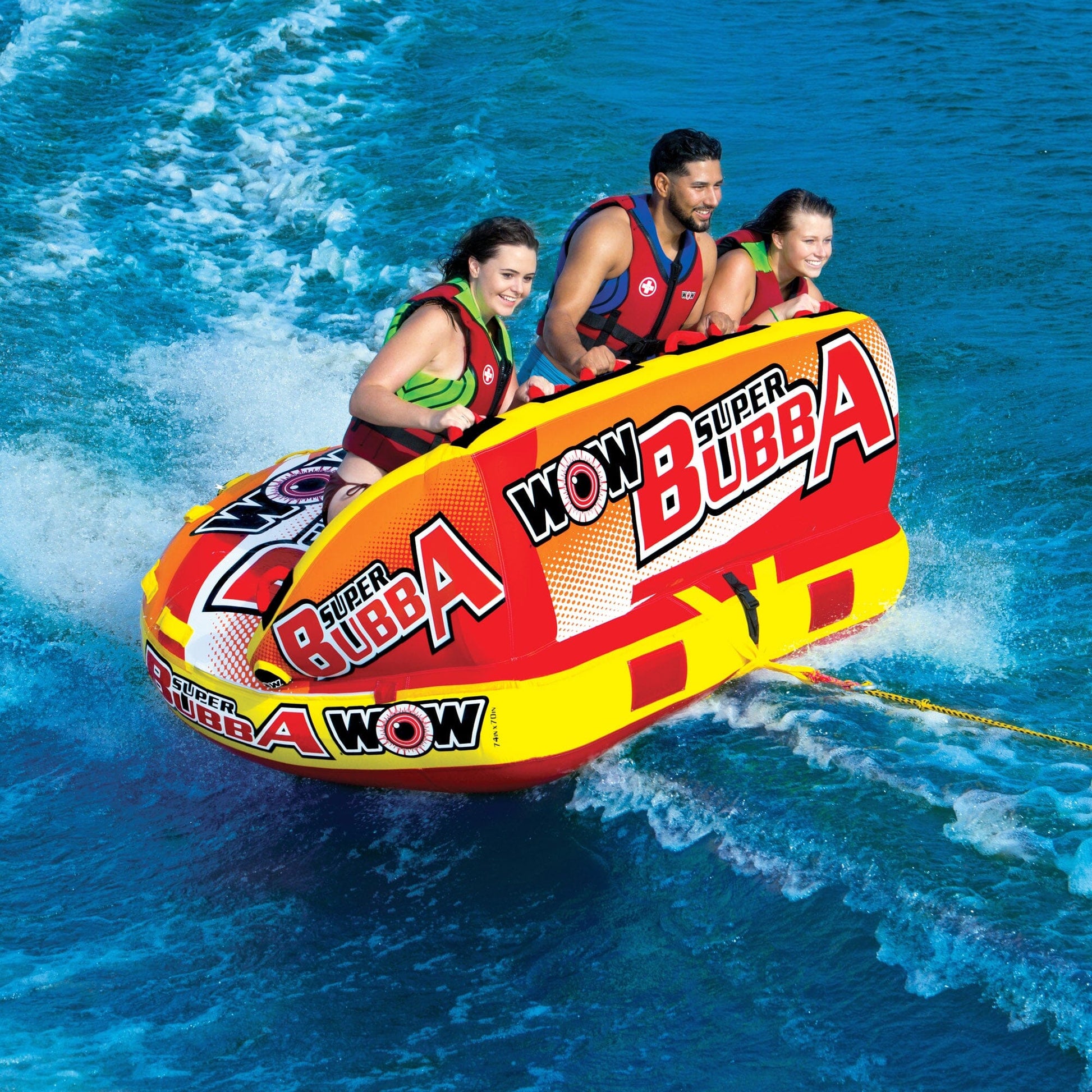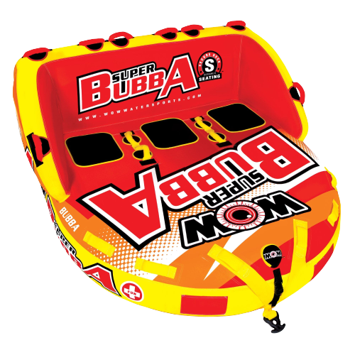 The Bubba couch style towables are some of the most popular tubes on the market. They make for a perfect starter tube for the family just getting into towables but also they are a tube that just about anybody can have fun on. The Bubbas come with a flat base for a smooth ride over the water and minimal drag on the boat. The SECURE DECK SEATING on the Bubbas come with a super high backrest with sidewalls which is great for keeping young kids safe and for giving them a secure feeling if they are just getting started on towables. But don’t get us wrong, these aren’t just for little kids. The high backrest just means it’s more difficult to fly off on the more wild rides. The smooth, flat base will get this baby going fast on the water if that’s what you’re in to. The Bubbas also come with front and back tow points so you can ride sitting, laying down, or kneeling chariot style. And after your ride is over the Bubbas make a perfect floating couch on the water. Great for relaxing with your friends at your favorite body of water.