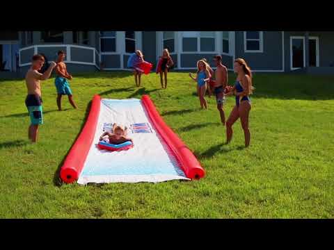 Looking for something special for your kid's next backyard birthday party? We think we have the perfect party favor for you. The WOW Super Slide is a giant 25' x 6' water slide for the lawn that will keep the kids entertained all afternoon long. We got tired of all the cheap lawn water slides out there that were barely lucky to last a whole day, so we decided to build our own and back it by our WOW 1-year warranty. The WOW Super Slide is made from extra thick, heavy-duty, super-slick embossed PVC that will help you slip and slide all the way to the end. In fact, it is more than twice as thick as most of the slides you will find in the market. And no need to add dish soap to keep this slide slippery. Our zig-zag patterned, 25' embedded sprinkler system, connects to the standard backyard hose, runs the length of the slide and has 100% water coverage so no dry spots. We also built it with sidewall pontoons to keep the water on the slide as well as your kids! Our favorite feature is the overlapping design, so you can purchase 2 or more slides and connect them all together for an even longer slide and twice the fun! Each slide comes with 2 Mega Sleds to cushion the fall and make the slide even more slippery. There, you now have everything you need to put on a great summer backyard party for your kids.
