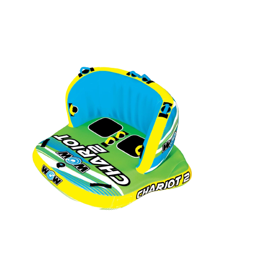 Chariot comes with all the safety, durability, and speed features you'd expect in a two person towable. Sit, stand, or kneel close to a friend as the two of you zip over blue waves and laugh with delight. In addition to having three ways to ride, there are dual tow points that allow the tube to face either direction. The backrest on Chariot, plus the foam webbing handles, provides support so you can stay on the float when you're speeding ahead and catching serious wind. You'll also love the vibrant green and blue colors, which brighten your day and add an inviting summer look. This towable lake float is made from heavy duty materials, so it'll deliver fun and excitement to your family for years to come.