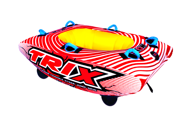 WOW is known for their FUN mix, now introducing the WOW TRIX - the next in Major League Towables. Enough to make your head SPIN, this ROTATING towable is the must-have for those looking to do tricks and twist through the waves. Lean, tilt, jump and spin your way through the water on the stainless-steel ball bearing 360-degree tow point, located at the bottom of your vessel. Surrounded by 6 padded handles to control your ride with ease. Got the spins? Just attach the fins! This spinning sensation's SECURE SOLO COCKPIT offers a smooth ride that cuts and dips through the waves when towed traditionally.
