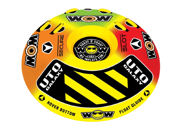 The UTO Galaxy is out of this world. A perfect towable if you want your friends to think you are from another planet. This tube is a hybrid; part deck tube and part cockpit with a hover bottom to keep it fast and glide on the water with little drag. One person can ride this tube sitting in the middle, cockpit style, or you can get two riders lying down like on a traditional deck tube. The versatility makes it seem like you are getting 2 tubes for the price of 1! A great towable for your family outings on the lake.