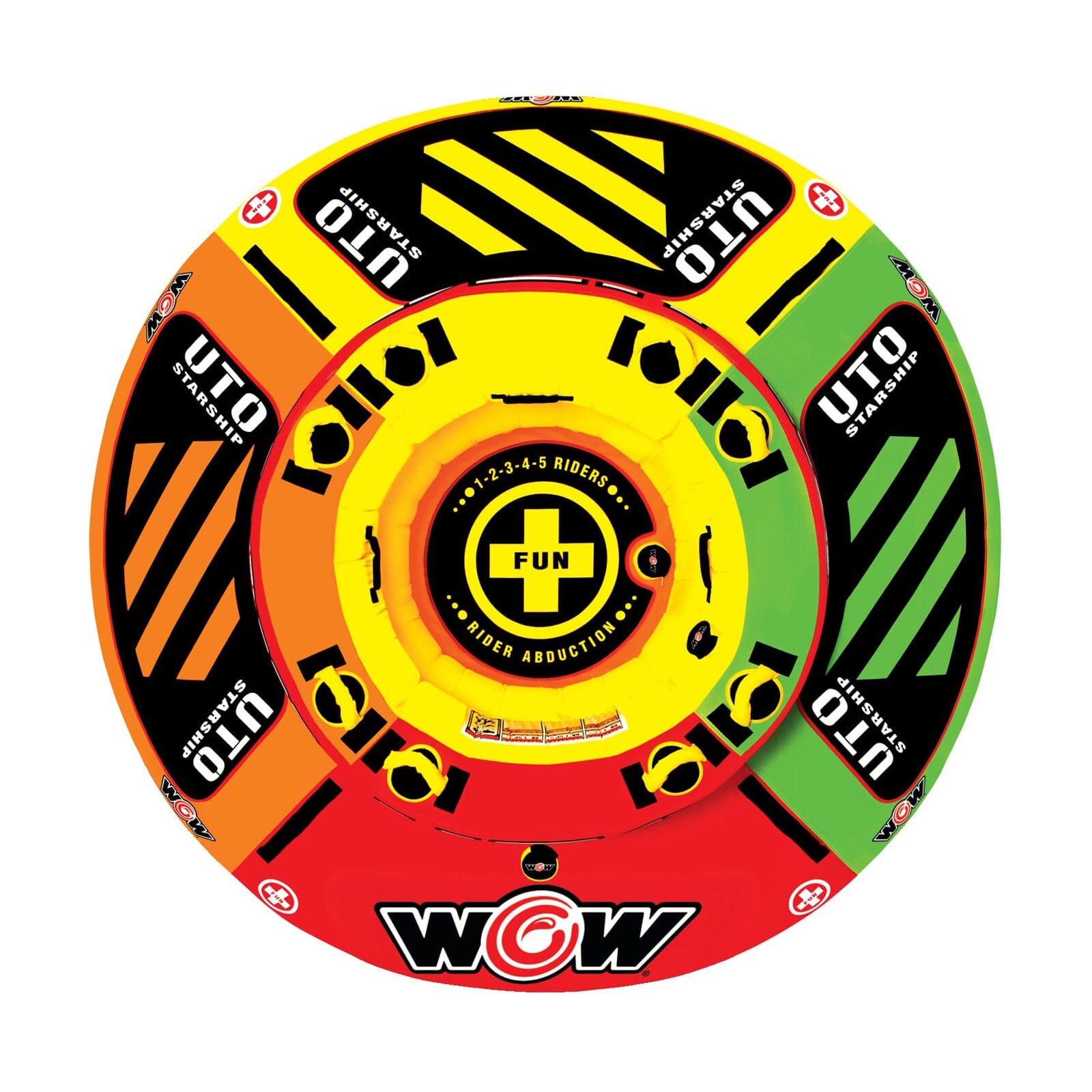 This unidentified towable object was brought to you by Leroy, our head designer, who could, quiet possibly, be from another planet. Modeled after the starship he may or may not have come here on, the UTO makes an awesome towable. This a BIG towable with a large, deep center crew cockpit for up to two riders and an outside deck radius that can fit at least 3 riders. The cockpit is deep enough to stand in and is for the more timid riders because there is very little chance of falling out. The outside deck is much more adventurous. On the outside the riders can stand, kneel or lay down. Each position on the outside deck has a large anti-slip EVA pad for traction. The floor of the central cockpit is a drop bottom which is what this tube mainly rides on. The drop bottom allows the tube to ride smooth and fast over the wake and in the turns and keeps the outside deck edge from digging into the water. This UTO rides like something from out of this world.Features: