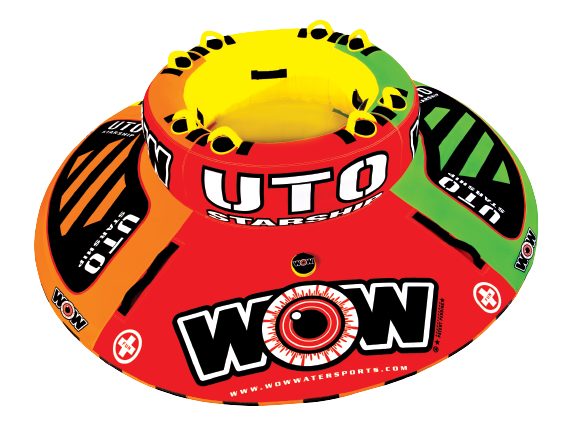 This unidentified towable object was brought to you by Leroy, our head designer, who could, quiet possibly, be from another planet. Modeled after the starship he may or may not have come here on, the UTO makes an awesome towable. This a BIG towable with a large, deep center crew cockpit for up to two riders and an outside deck radius that can fit at least 3 riders. The cockpit is deep enough to stand in and is for the more timid riders because there is very little chance of falling out. The outside deck is much more adventurous. On the outside the riders can stand, kneel or lay down. Each position on the outside deck has a large anti-slip EVA pad for traction. The floor of the central cockpit is a drop bottom which is what this tube mainly rides on. The drop bottom allows the tube to ride smooth and fast over the wake and in the turns and keeps the outside deck edge from digging into the water. This UTO rides like something from out of this world.Features: