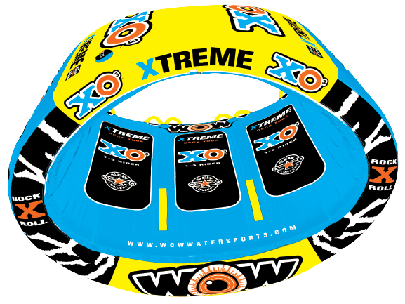WOW's most exciting towable yet! Built for 1-3 riders, the XO Extreme is a one of a kind, oval shaped design towable with a rocker-ed bottom to provide the most excitement ever on the water! Because of its patented oval shape design the amount of surface area touching the water is minimal which allows for a fast ride and less drag on your boat (i.e. better gas mileage) as it slips and slides across the wake with ease. This new concept from WOW has a high profile and is highly visible in the water, so expect to get a lot of attention while you are zooming back and forth behind the boat. It also makes for a great lounger, so after your thrilling ride sit back, relax, and float free in your favorite body of water on the XO Extreme.