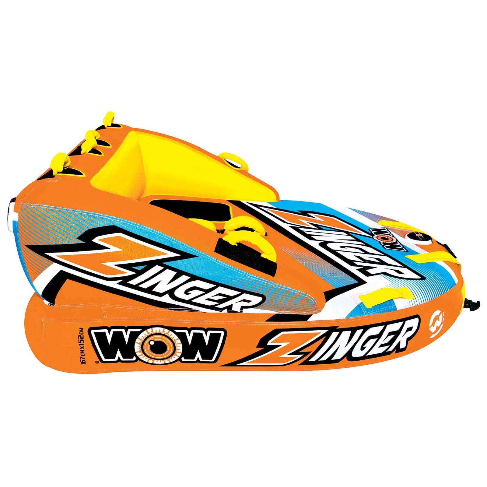 The Zinger couch style towable is one of the most popular tubes on the market. The Zinger makes for a perfect starter tube for the family just getting into towables but also is a tube that just about anybody can have fun on. The Zinger comes with a flat base for a smooth ride over the water and minimal drag on the boat. The SECURE DECK SEATING on the Zinger comes with a super high backrest with sidewalls which is great for keeping young kids safe and for giving them a secure feeling if they are just getting started on towables. But donÕt get us wrong, this isn't just for little kids. The high backrest just means itÕs more difficult to fly off on the more wild rides. The smooth, flat base will get this baby going fast on the water if thatÕs what youÕre in to. The Zinger also comes with front and back tow points so you can ride sitting, laying down, or kneeling chariot style. And after your ride is over the Zinger makes a perfect floating couch on the water. Great for relaxing with your friends at your favorite body of water.